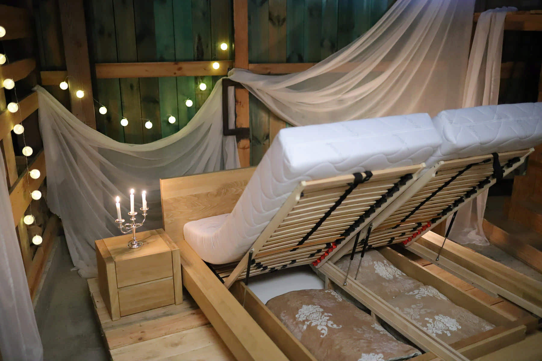 Każdy z dwóch stelaży wyposażony jest w po dwa siłowniki, czy też inaczej to nazywając sprężyny gazowe. Razem mamy cztery siłowniki, które mogą swobodnie unosić jeden duży materac przy jednoczesnym uniesieniu stelaży przy pomocy przytwierdzonych uchwytów. Lub też unosimy pojedynczo stelaże jeżeli stosujemy dwa materace, po jednym na każdy stelaż. Otwieranie i opuszczanie stelaży nie sprawia żadnego większego wysiłku.