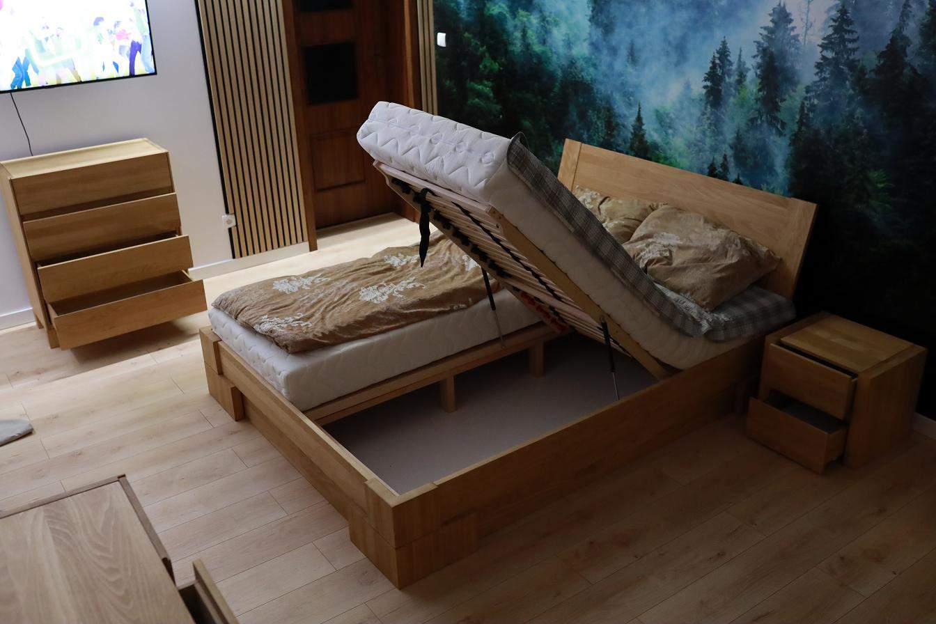 Łoże lity dąb Vanes_D z pojemnikiem na pościel typu MAXI 160x200 + dwie szafki nocne + komoda