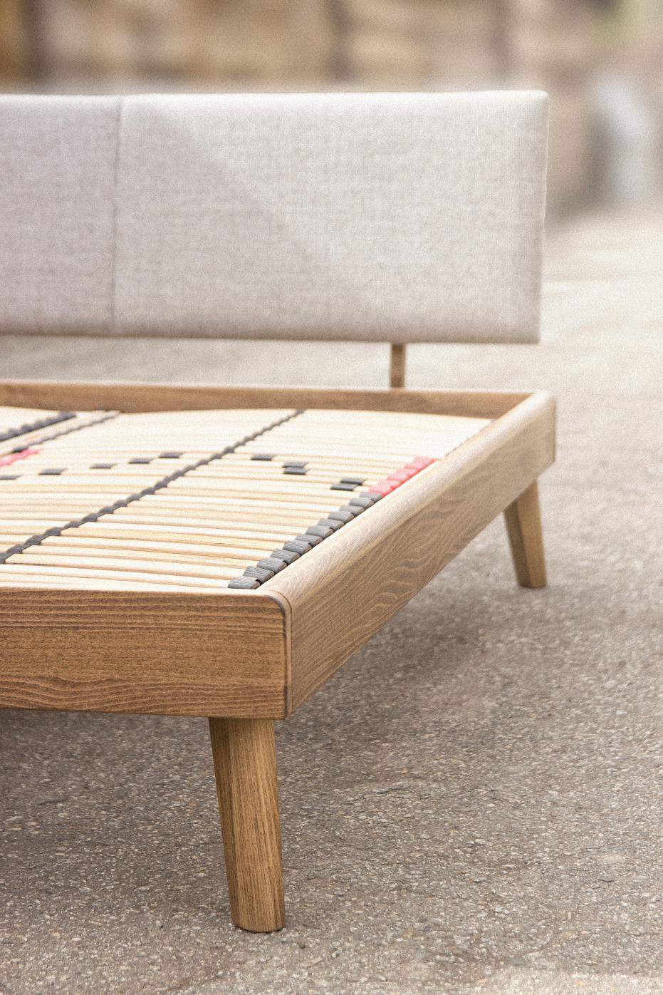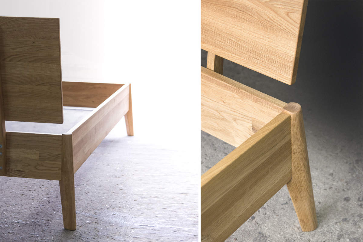 Na uwagę zasługuje wygląd nożek, które lekko są podgiete na zewnątrz, całkowicie lite z drewna dębowego jak całe łóżko, niezwykle mocne skręcane z elementami łoża przy pomocy śrub i wprasowanych gwintów.