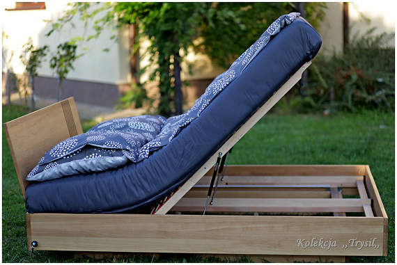 Naturalnie. Stelaży w rzeczywistości jest dwa. Każdy w rozmiarze po 70x200 cm. Każdy wyposażony w parę siłowników gazowych, które umożliwiają uniesienie 2/3 długości stelaża ukazując dostęp do pojemnika na pościel. Wyposażone są w 28 sztuk listew giętych ze sklejki brzozowej, każda o szerokości 35mm z odstępem między nimi 28mm. Co ciekawe i warte podkreślenia, otóż sześć par listew jest umocowanych podwójnie, dokładnie jak leżymy, to w okolicach lędźwi naszego ciała. Dodatkowo te sześć par ma możliwość regulacji stopnia twardości nacisku na nie.