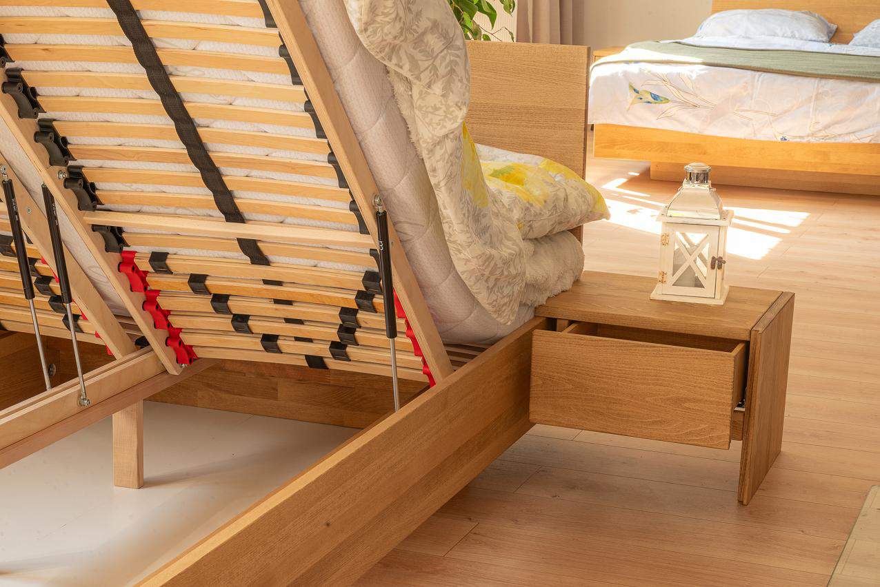 zestaw dębowe łoże lewitujące z szafkami i komodą: BALLEGA_D 140x200 cm, z pojemnikiem na pościel i stelażem